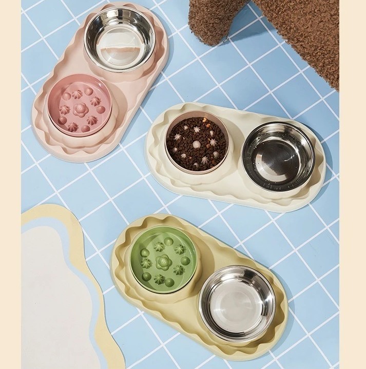 В комплект входит миска из нержавеющей стали и специальная медленная кормушка, которая помогает питомцу есть медленнее, улучшая пищеварение и предотвращая переедание.