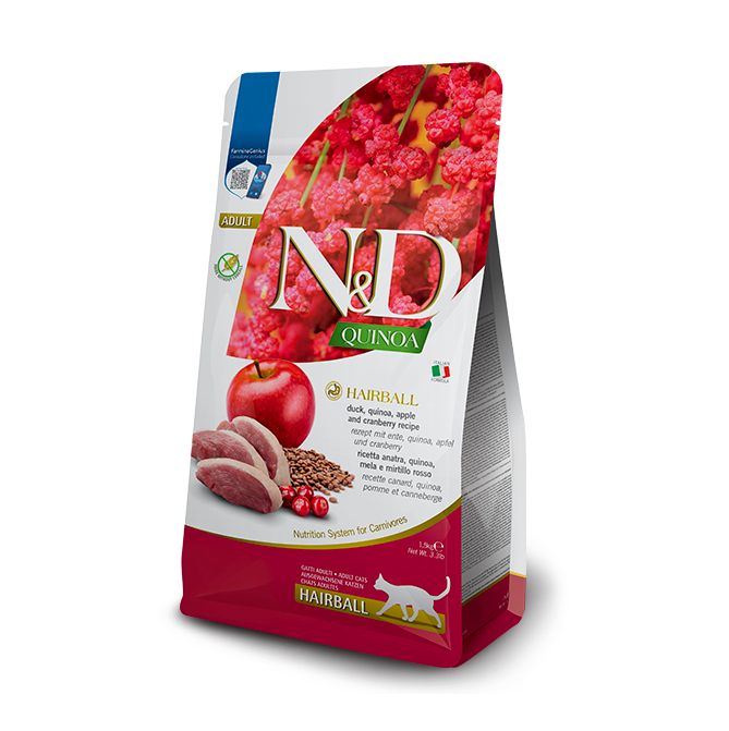 Полнорационный беззерновой сухой корм с уткой, киноа, яблоком и клюквой для выведения колтунов шерсти из желудочно-кишечного тракта у взрослых кошек всех пород. Рацион обеспечивает профилактику сбивания шерсти после ее попадания в желудок и кишечник, что является очень ценной функцией, особенно для длинношерстных любимцев