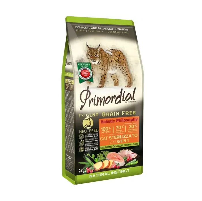 Primordial Neutered Skin&Coat Salmon & Turkey для взрослых стерилизованных кошек для здоровья кожи и шерсти с лососем и индейкой (лосось — 35%, индейка — 15%)