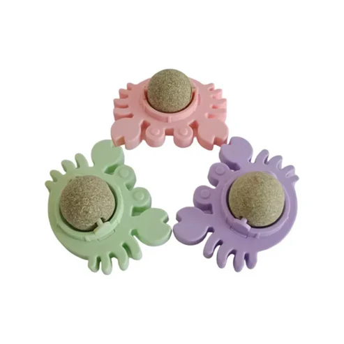 Игрушка для кошек вращающаяся в форме краба, которую можно крепить к стенам или полу. Включает в себя вращающийся на 360 градусов мячик с кошачьей мятой, который кошки могут лизать и с которым могут играть.