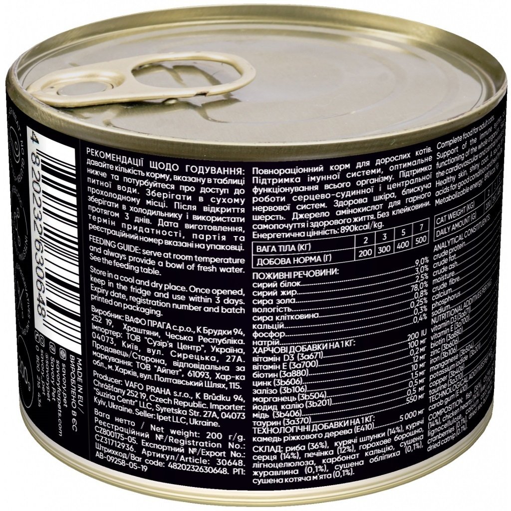Рыба (36%), куриные желудки (14%), куриные сердца (14%), печень (12%), гороховая мука, лигноцеллюлоза, карбонат кальция, сушеная клюква (0.1%), сушеная облепиха (0.1%), сушеная кошачья мята (0.1%).