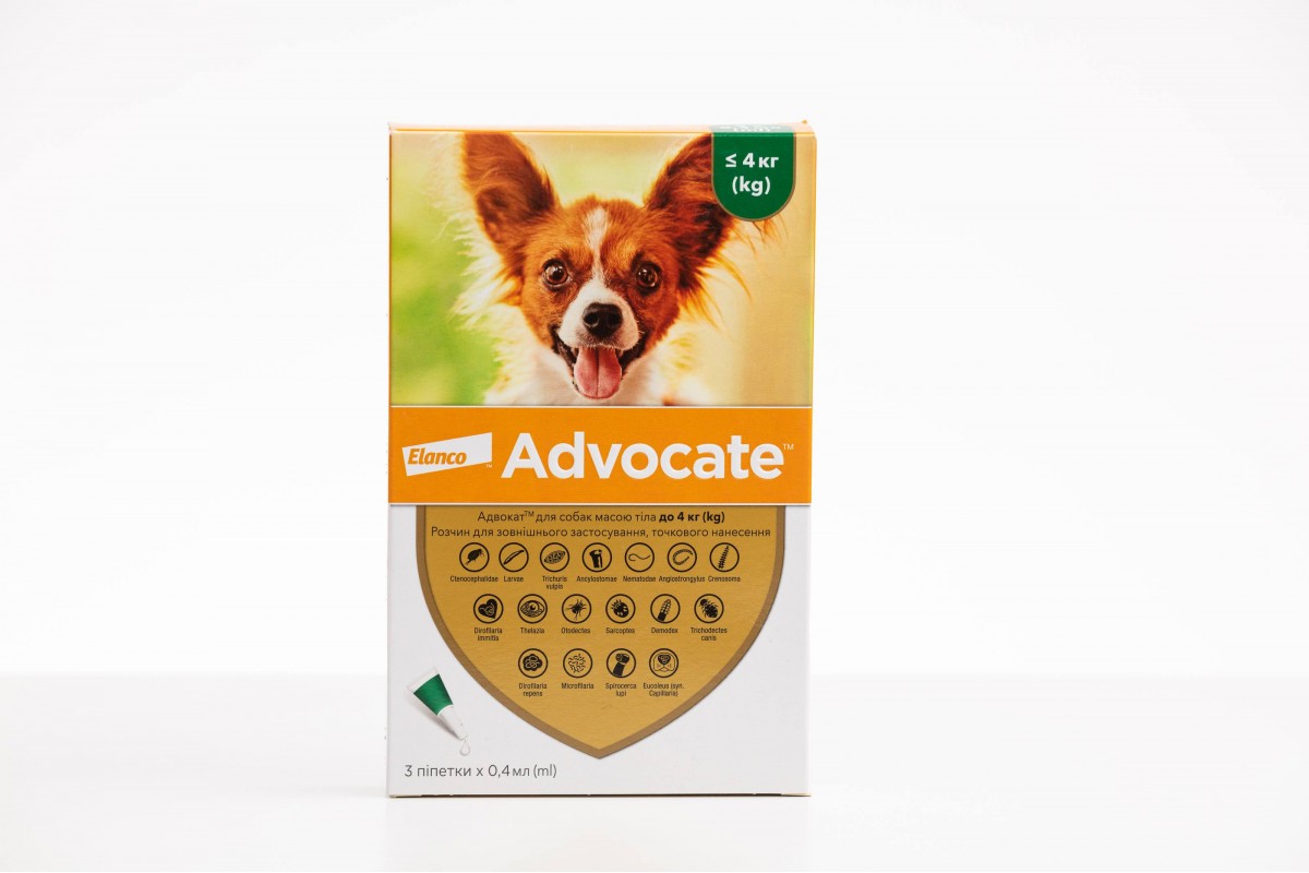 Профилактика и лечение собак при смешанных паразитарных инвазиях блохами, вшами, власоедами, желудочно-кишечными нематодозами, лечения аллергического блошинного дерматита, демодекоза, отодектоза, саркоптоза, ангиострогилеза, кренозомоза, дирофиляриоза (эффективен против микрофилярий). Адвокат обладает широким спектром противопаразитарного действия, активен в отношении паразитирующих у собак демодекозных (Demodex canis) и саркоптоидных (Sarcoptes canis, Otodectes cynotis) клещей, блох (Stenocephalides canis), вшей (Linognatus setotus), власоедов (Trichodectes canis), личиночных и половозрелых фаз развития кишечных нематод, включая Тохосаra canis, Toxascaris leonina, Ancylostoma caninum, Ancylostoma tubaeforme, Uncinaria stenocephala, Trichuris vulpis, и личиночных форм Dirofilaria immitis.
