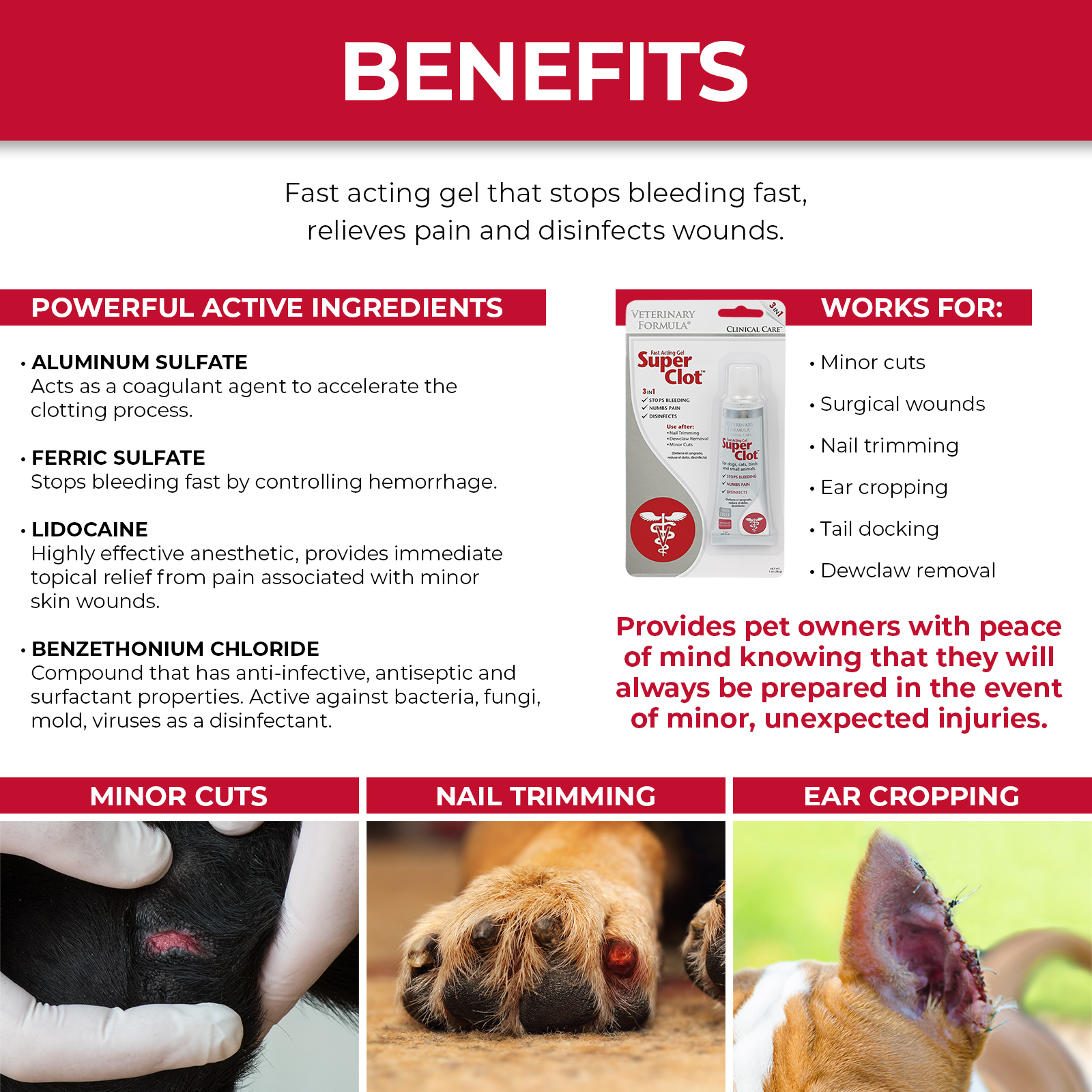 - ОБЛЕГЧАЕТ БОЛЬ — в отличие от карандашей или кровоостанавливающего порошка для собак, Super Clot изготовлен из лидокаина и бензетония хлорида, что обеспечивает сильное, мгновенное облегчение, вызывая онемение и дезинфицируя пораженную область.